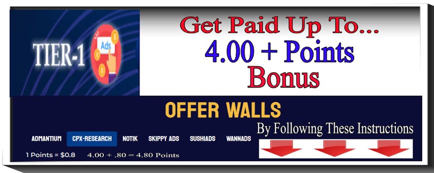 Earn Up To 4.00 Bonus Points for your Tier1 Ads CPX-REASEARH Offer Wall Account - TODAY ONLY.